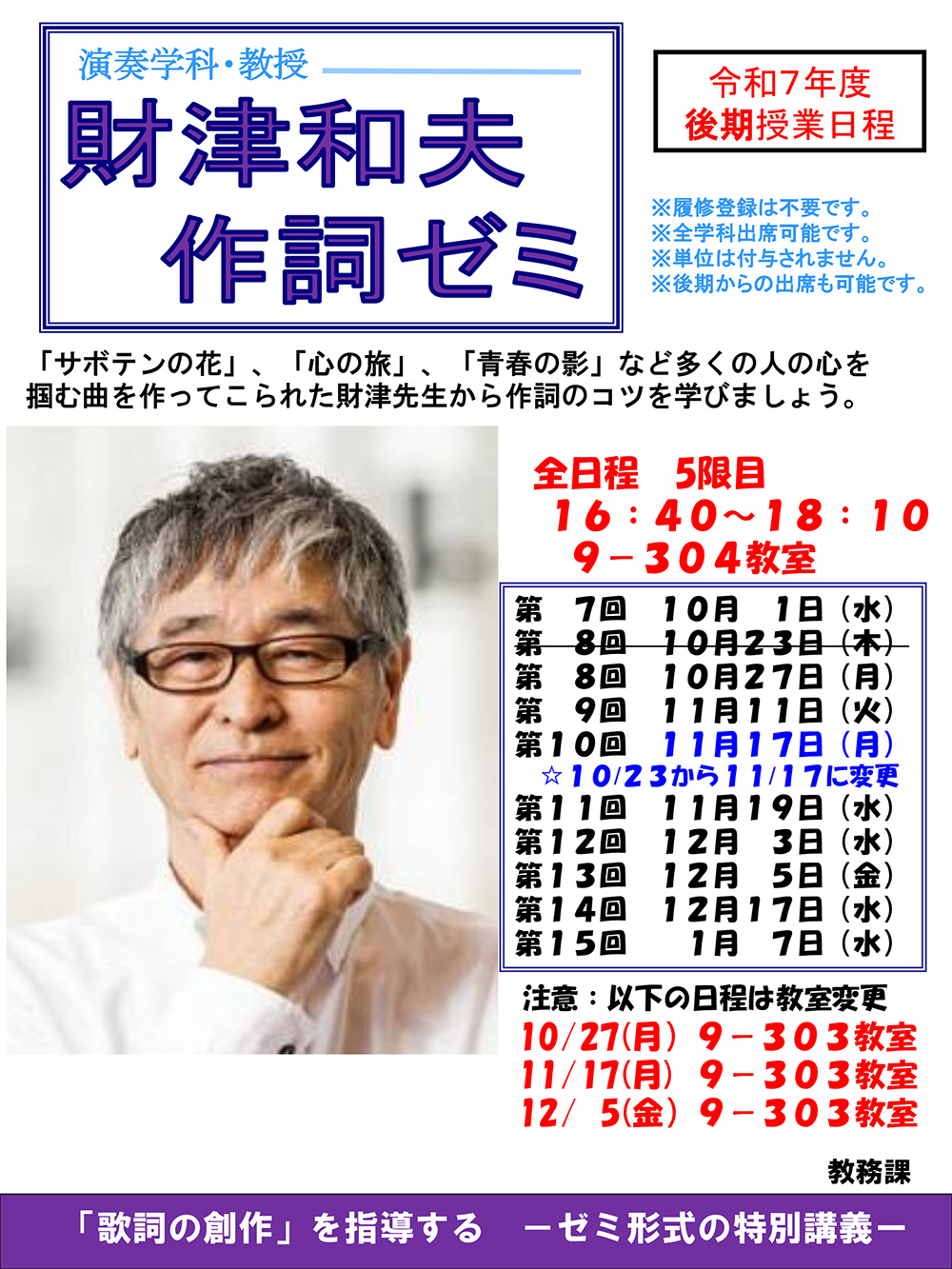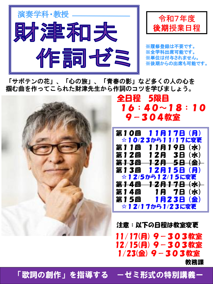 この度、演奏学科(通学部)教授の財津和夫先生による特別講義が開催されることとなりました。