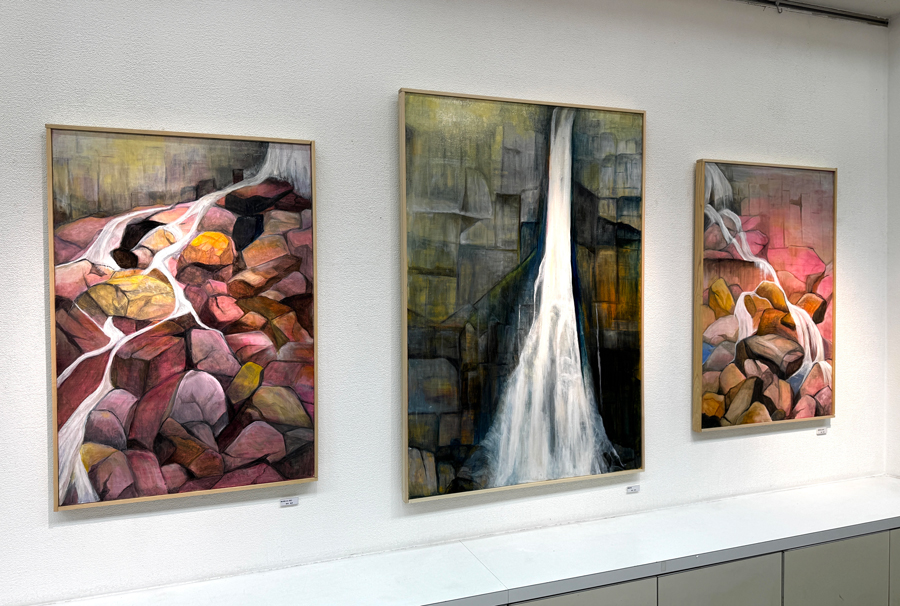 田中さんは、かつては海を主題にしていましたが、真冬の阿蘇山で出会った氷瀑に魅了されて以来、滝をテーマに制作。「絵を描くことで心身に力が湧いてきます」と、創作が健康の支えになっていることも語りました。